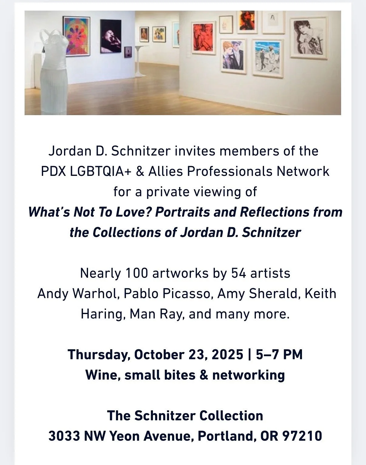 Jordan D. Schnitzer invites members of PDX LGBTQIA+ Professionals Networking Group for an exclusive viewing and networking experience at The Schnitzer Collection.